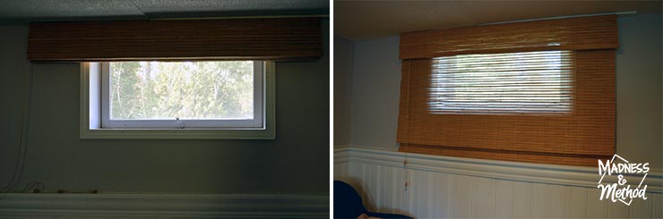 Our two smaller windows (one in is the basement living room part, the other in the laundry room) were a bit narrower (but taller) than the other ones, so I figured I would use these as my “real blind” windows. I measured how much length I needed for each window, and cut my bamboo blinds once, giving each window a bit of extra length.