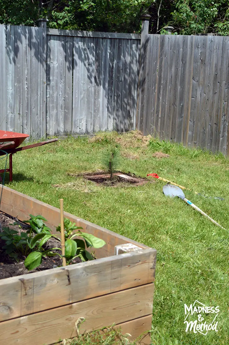 Since moving into our house, we’ve planted two very little trees; one in the backyard (some sort of pine tree) and one in the front (a lilac). Last year we made a big to-do list for our yard, and one of the small tasks that I wanted to get done this summer, was making our tree holes bigger. (I called them tree holes since I didn’t know the technical term). Turns out, it’s just a simple tree surround, and let me show you how I accomplished this task :)